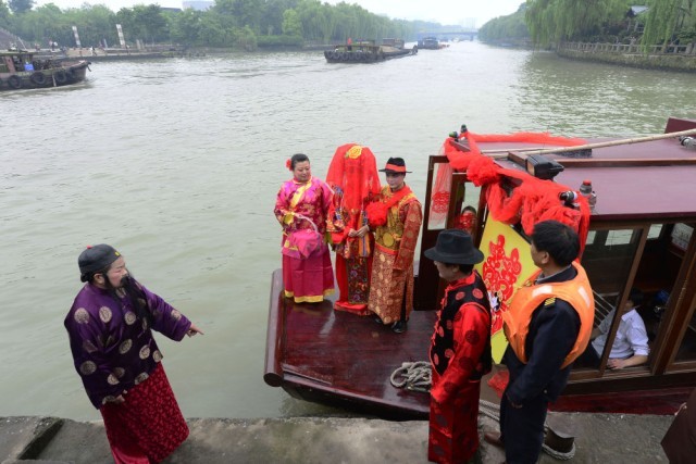 2014年4月26日,一位新郎在浙江杭州北新关码头迎娶乘船而来的新娘。