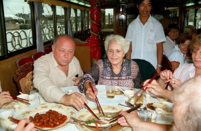 1985年,在江苏无锡大运河段上,外国游客在游船上品尝太湖船菜。太湖船菜的菜肴都是太湖盛产的鱼蟹河鲜,味美可口,别具一格。