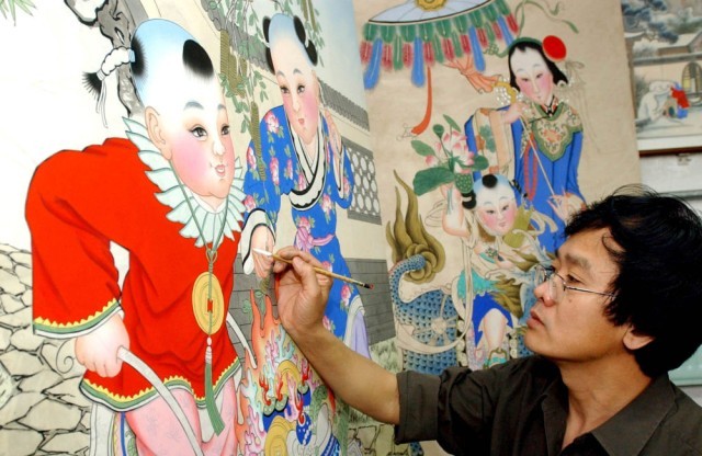 2003年,天津杨柳青“年画张”画店画师在绘制年画。