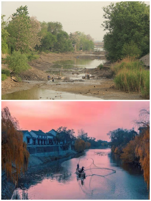 江苏扬州江都区明清运河故道整治前后对比(上图:2012年;下图:2020年)。