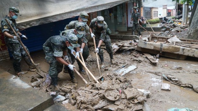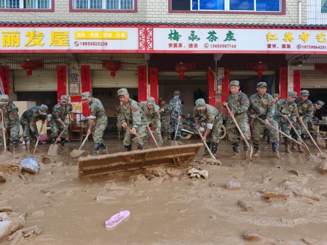 6月20日,福建省军区龙岩军分区民兵在龙岩市上杭县蓝溪镇进行清扫淤泥工作。新华社发(江晓珍 摄)