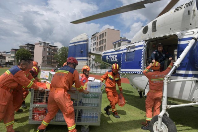 6月19日,救援人员在将救灾物资搬上直升机,准备运往受灾严重的广东省梅州市平远县泗水镇大新村。(新华社记者 卢汉欣 摄)