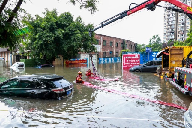 6月21日,在重庆大渡口区双山路,大渡口区的消防救援人员在积水中使用抽水泵抽取城市道路积水。新华社发(田辉世 摄)