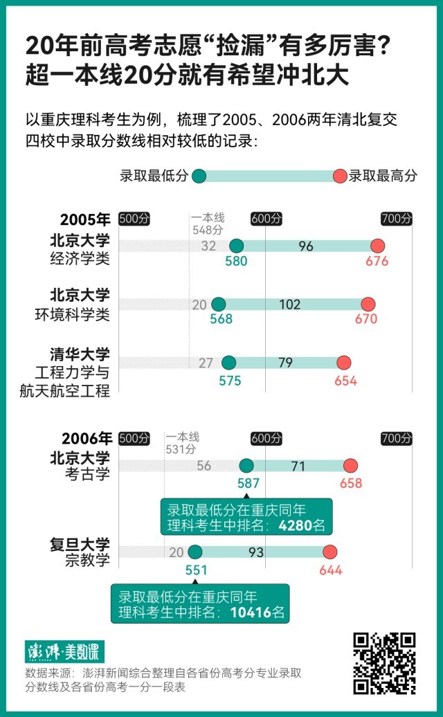 相比如今高考志愿填报中最多捡漏尾部的“985”高校,20 年前的高考统招中,是有清华、北大等顶尖学府录取分数爆冷的。例如在 2005年 和 2006 年,就有 3 位重庆理科考生以 580 分左右的分数读上了北京大学。