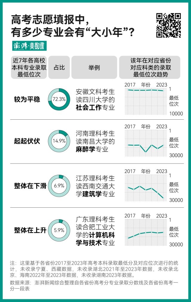 实际上,过去 7 年里整个高考志愿填报系统中,录取分数线较为稳定的专业占到了七成多,而剩下 30% 不到的专业中,也只有一半多有“大小年”的情况。