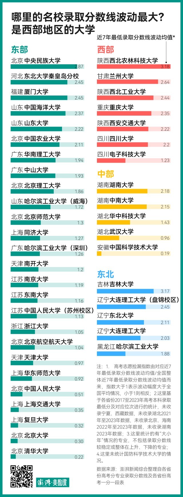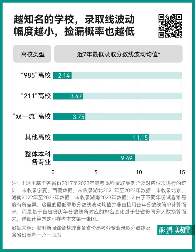 “大小年”现象的出现,和大家追随上一年录取分数线紧密相关。澎湃新闻通过梳理近 3 年全国各省份的高考分专业录取分数线后发现,捡漏上“985”“211”名校的案例并非个案。