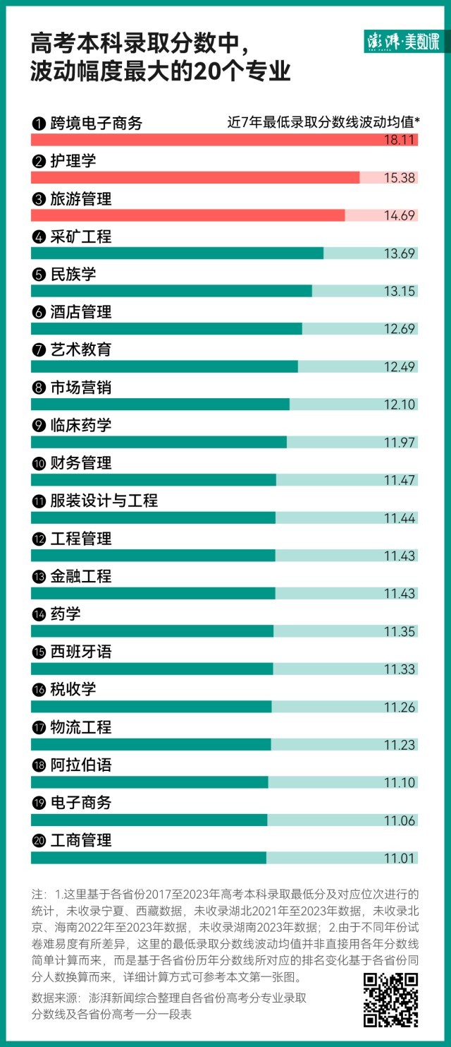 在波动幅度最大的 20 个专业中,管理学的专业尤其多:跨境电子商务、旅游管理、酒店管理、市场营销、财务管理、工程管理、电子商务和工商管理。