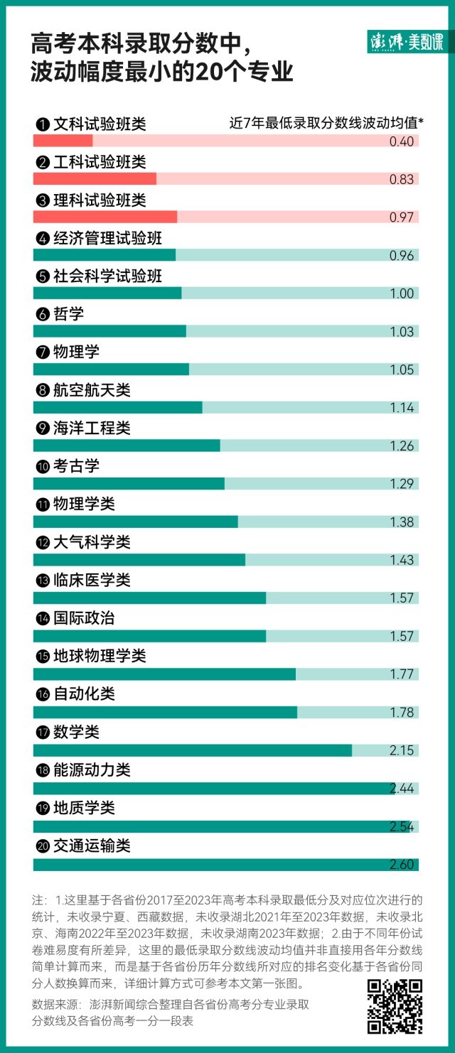 但让我们感到意外的是,在录取分数线起起伏伏的专业中,波动幅度整体最小的,除了 XX 试验班类这类高校打造的重点班外,剩下的非打包类专业中,也有一些冷门方向。