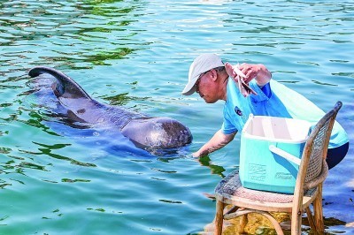 海南三亚海昌生物保育中心的工作人员给短肢领航鲸“海棠”喂食。新华社发