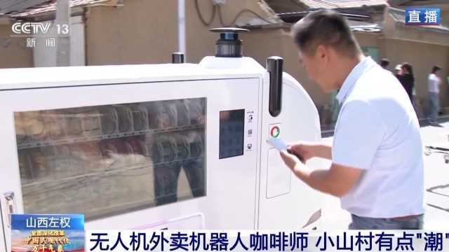 这个小山村里的科技范不止于此,大家通过镜头可以看到,在我身旁往来不少车辆,它们好像有一些不同,你看这个在街上到处行进的无人售货车,我们走到它旁边就会停止,然后手机扫描二维码可以购买到饮料、零食等商品了。