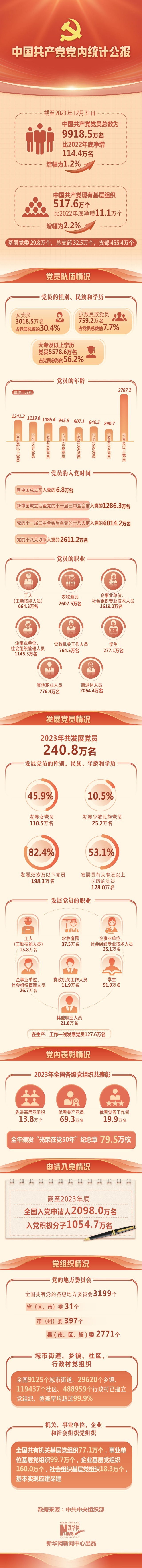 中央组织部最新党内统计数据显示,截至2023年底,中国共产党党员总数为9918.5万名,比上年净增114.4万名。党的基层组织517.6万个,比上年净增11.1万个。中国共产党党员队伍结构持续优化,基层党组织政治功能和组织功能进一步增强。一图速读最新中国共产党党内统计数据。
