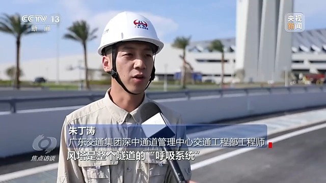 广东交通集团深中通道管理中心交通工程部工程师 朱丁涛:风塔是整个隧道的呼吸系统,它设置的位置邻近隧道出入口,主要配合轴流风机将废气排出到隧道外,万一隧道发生火灾,也可以快速将沉管内的烟气排出隧道。
