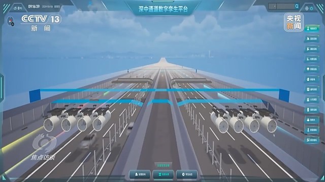 在深中通道指挥大厅里,大屏幕上显示的是与深中通道同步建设完成的数字孪生平台。它通过精准的三维仿真建模技术,以1∶1的比例高度还原了深中通道桥、岛、隧、水下互通等真实物理环境,可以实时呈现车辆运行情况,并具备车辆智能追踪与驾驶行为分析、危险品运输车辆管控等智慧管控功能。