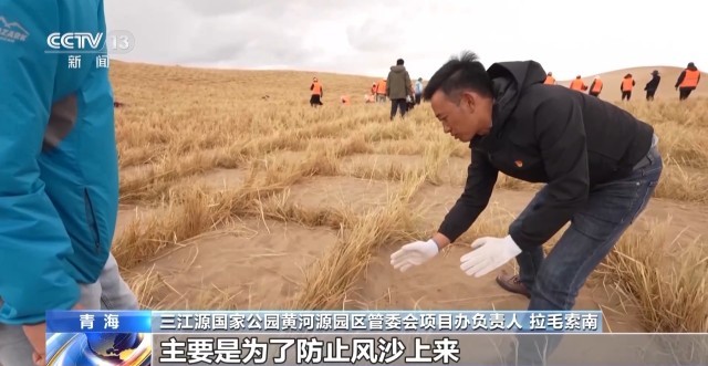 此时正值盛夏,而在青海省黄河源,气温还不到10摄氏度。黄河源园区的党员干部带领当地群众正在茫茫沙丘上打围稻草方格,用一年中仅有的这一个月种草黄金时间,完成3万亩封沙育草作业。
