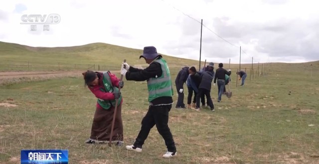 三江源国家公园黄河源园区管委会项目办负责人 拉毛索南:草方格整体打好以后,把草籽洒在这些中间里面,它就主要是为了防止风沙上来,把草籽埋得更深。