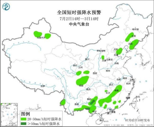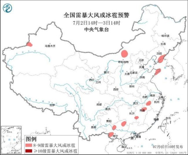 中央气象台7月2日10时继续发布强对流天气蓝色预警: