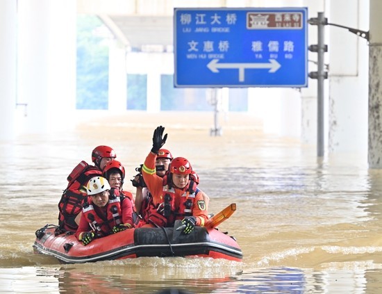 6月19日,在广西壮族自治区柳州市滨江西路,应急救援人员转移受困群众。视觉中国供图