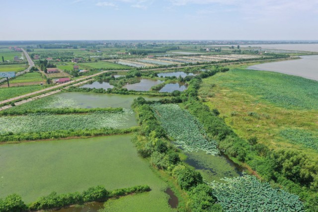 这是在湖南省益阳市大通湖区河坝镇拍摄的由中国科学院设计的大通湖流域农业面源污水末端强化处理设施(2023年7月10日摄,无人机照片)。大通湖地处洞庭湖腹地,被称作“洞庭之心”。