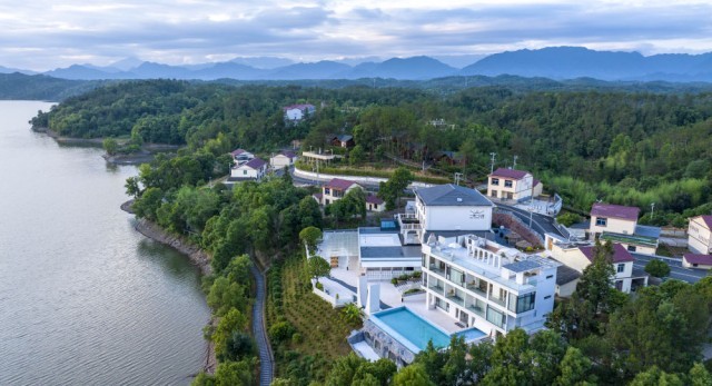 这是江西省武宁县修河畔“一渡一山海”民宿群,一些返乡农民在这里受聘为民宿管家(2024年6月3日摄,无人机照片)。