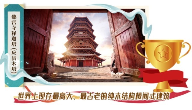 应县木塔建于辽清宁二年(公元1056年),与意大利比萨斜塔、法国巴黎埃菲尔铁塔并称“世界三大奇塔”。采用纯木结构搭建,全塔无钉无铆。全塔使用的斗拱形式达50余种,有“斗拱博物馆”之称。