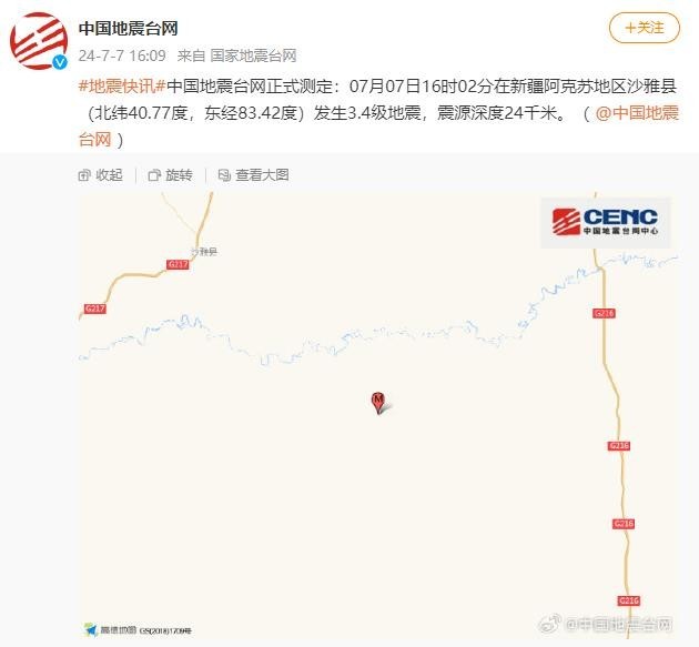 新疆阿克苏地区沙雅县发生3.4级地震,震源深度24千米