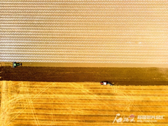 6月28日,新疆生产建设兵团第三师45团12连职工在麦田里边翻地边播种小米。6月下旬正是“三夏”农忙时节,人们抢抓农时抢收抢种,田间地头一派忙碌景象。王志清摄