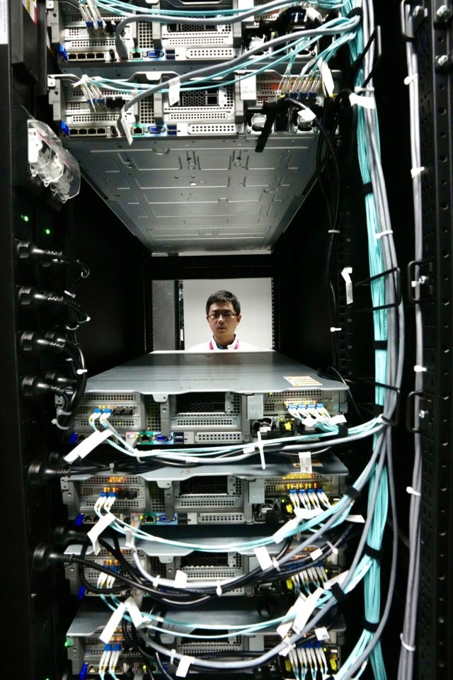 2月27日,克拉玛依云计算产业园区华为云服务数据中心,技术人员正在巡查。新华社发(崔文娟 摄)