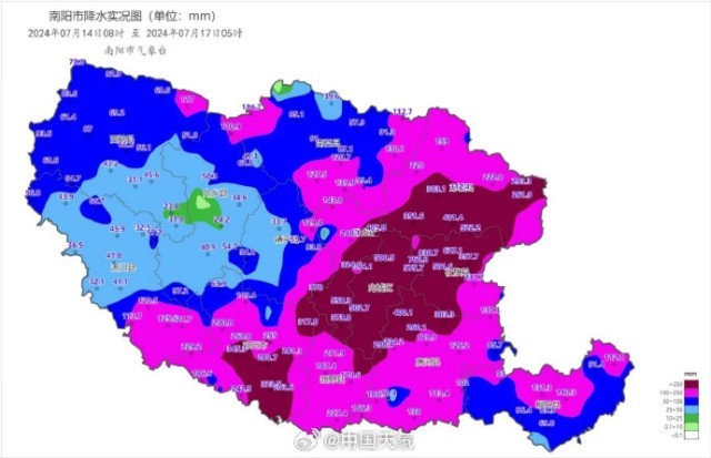 据@河南气象, 14日8时至17日5时,河南黄河以南大部出现暴雨到大暴雨,其中南阳东部、平顶山东部、许昌南部、漯河、周口西部、商丘中部等地出现特大暴雨。降水量最大前三分别为:社旗县大冯营830.7毫米、社旗县蓝海森源760.8毫米、社旗627.1毫米。社旗国家级气象站降水量突破建站以来日降水量极值,社旗、邓州2个国家级气象站(7月14日至16日)突破建站以来连续3日最大降水量历史极值。