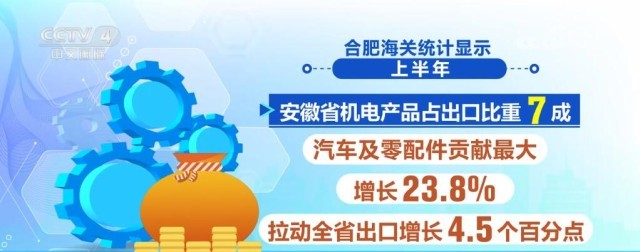 合肥海关统计显示,今年上半年,安徽省机电产品占出口比重七成,汽车及零配件贡献最大,增长23.8%,拉动全省出口增长4.5个百分点。安徽省货物贸易进出口总值3967.8亿元人民币,创历史新高,同比增长7.4%。其中,上半年及当月规模均位居中部地区第一。