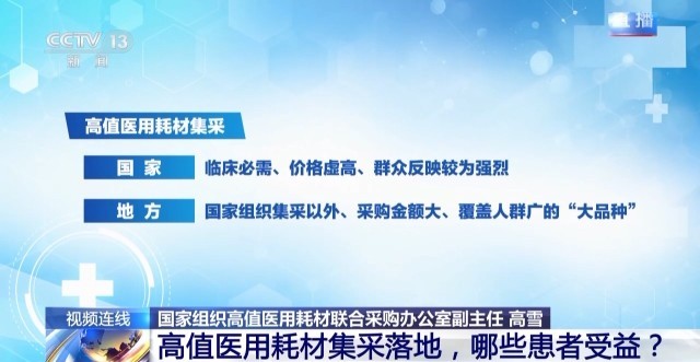 国家组织高值医用耗材联合采购办公室副主任 高雪:我们在去年11月底,完成了第四批高值医用耗材带量采购的招标工作。半年的时间,我们组织了医疗机构和生产企业进行签约,随后生产企业进行生产,然后保供。到现在为止,很多的省份都已经完成了产品在医疗机构的准备。