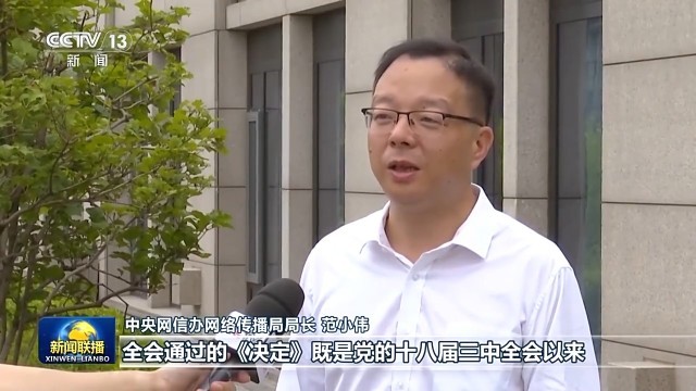 中央网信办网络传播局局长 范小伟:全会通过的《决定》,既是党的十八届三中全会以来全面深化改革的实践续篇,也是新时代新征程推进中国式现代化的时代新篇。我们将深入学习贯彻全会精神,进一步增强坚定拥护“两个确立”、坚决做到“两个维护”的政治自觉,适应信息技术发展新形势,不断健全网络综合治理体系,进一步加强网络文明建设,更好服务党和国家工作大局。