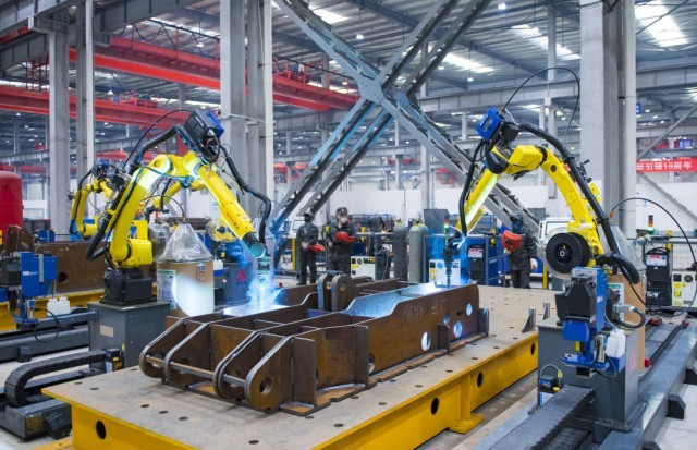 4月22日,在位于贵州省六盘水市高新区内的一家装备制造企业生产车间,机械手臂进行焊接作业。新华社发(尚宇杰摄)