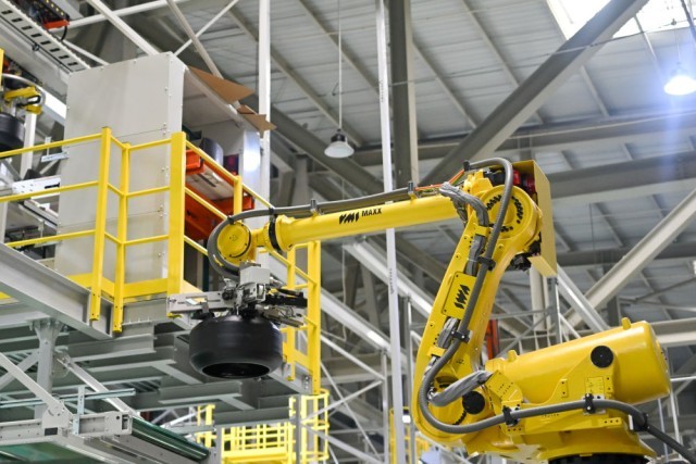 在杭州中策钱塘实业有限公司轮胎数字工厂车间,机械臂在运输轮胎半成品(7月26日摄)。新华社记者 江汉 摄