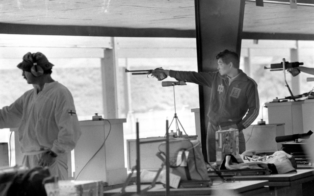 1984年7月29日,中国运动员许海峰(右)在洛杉矶奥运会男子自选手枪射击比赛中。新华社记者 官天一 摄(传真照片)