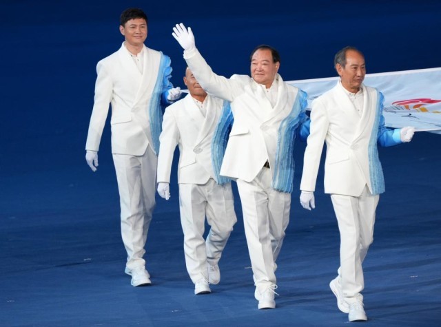 2023年9月23日,许海峰(右二)在第19届亚洲运动会开幕式上手持亚奥理事会会旗向观众挥手致意。新华社记者 杜宇 摄