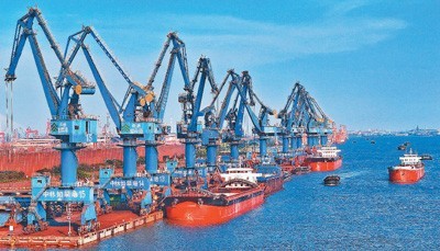 7月23日,江苏省如皋市长江镇,船舶在中林如皋港务集团有限公司码头进行卸运货物作业。吴树建摄(人民视觉)