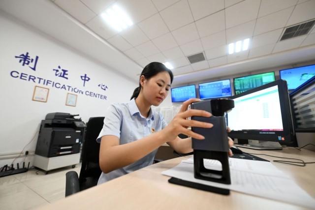 工作人员在天津市滨海新区政务服务中心制证中心内打印证件(7月30日摄)。