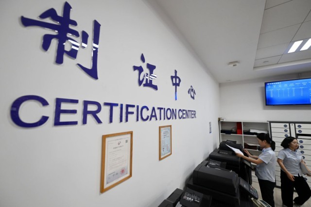 工作人员在天津市滨海新区政务服务中心制证中心内准备盖章(7月30日摄)。