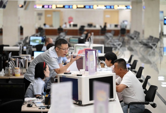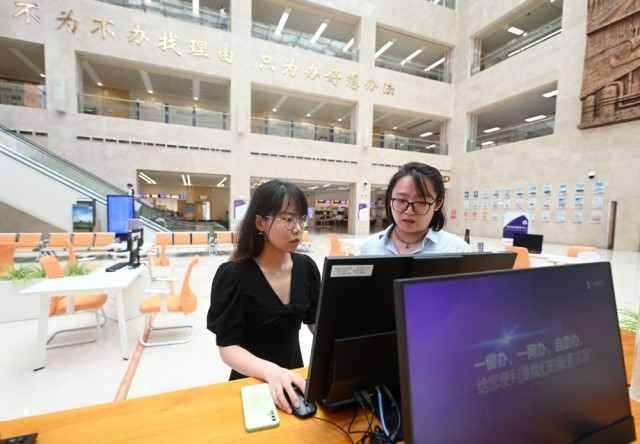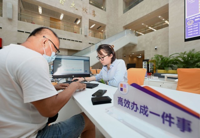 在天津市滨海新区政务服务中心,工作人员在“高效办成一件事”专区为市民办理业务(7月30日摄)。