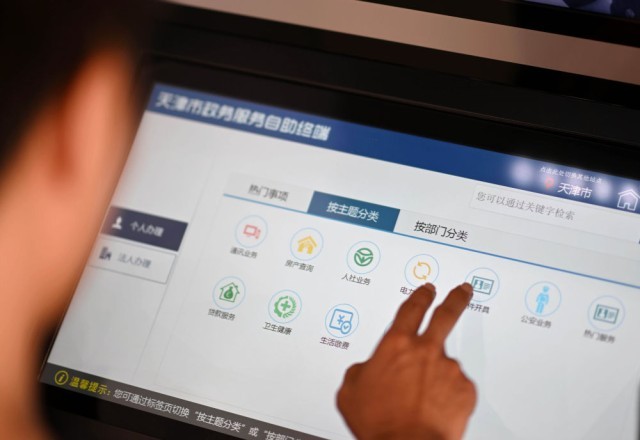 在天津市滨海新区政务服务中心,市民在自助服务厅内使用自助终端办理业务(7月30日摄)。
