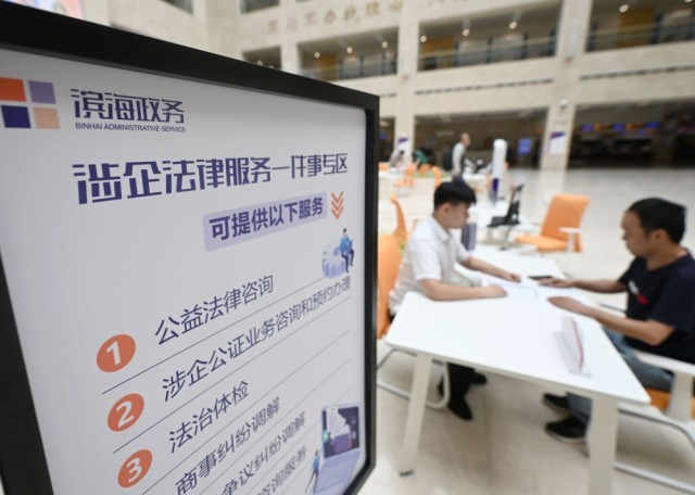 在天津市滨海新区政务服务中心,工作人员在“涉企法律服务一件事”专区为市民提供服务(7月31日摄)。