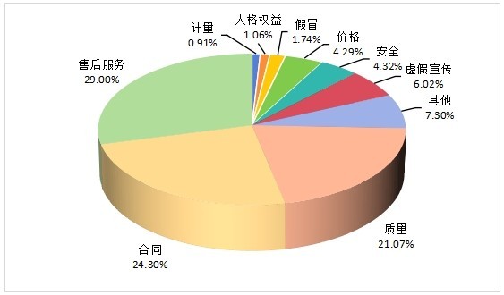 根据投诉性质(如图1所示),售后服务问题占29.00%,合同问题占24.30%,质量问题占21.07%,虚假宣传问题占6.02%,安全问题占4.32%,价格问题占4.29%,假冒问题占1.74%,人格权益问题占1.06%,计量问题占0.91%。
