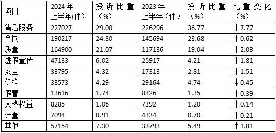 与2023年上半年相比(如表1所示),质量、虚假宣传、安全问题投诉比重上升,售后服务、价格、人格权益问题投诉比重下降。