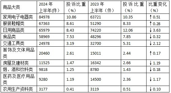 根据2024年上半年商品大类投诉数据(如图2、表2所示),家用电子电器类、服装鞋帽类、日用商品类、食品类、交通工具类投诉量居前五位。与2023年上半年相比,家用电子电器类、服装鞋帽类、首饰及文体用品类投诉量比重上升,日用商品类、交通工具类、房屋及建材类投诉量比重下降。