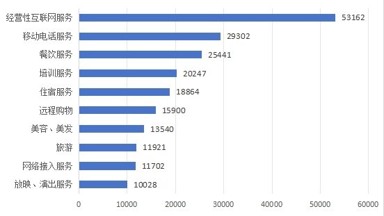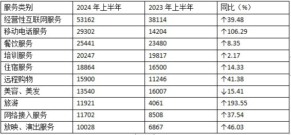在具体服务投诉中,投诉量居前五位的分别为(如图5所示)经营性互联网服务、移动电话服务、餐饮服务、培训服务、住宿服务。与2023年上半年相比,旅游、移动电话服务投诉量显著上升,美容、美发服务投诉量下降。