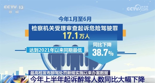 今年1月至6月,检察机关受理审查起诉危险驾驶罪17.1万人,同比下降38.7%,达到2021年以来同期最低;醉驾犯罪占刑事案件的比例从2022年31.9%下降至15.6%。统一司法标准,检察机关对危险驾驶罪决定起诉14.3万人,同比下降12.2%;对情节显著轻微、不构成犯罪的案件,监督公安机关撤案近2万人。