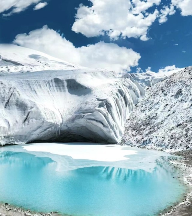 这里人迹罕至,鲜少有人能一睹其雄伟神奇。木孜塔格峰“伸舌川冰川”外形像一个巨大的伸来出的舌头,旁边雪山林立和大大小小很多个冰川。木孜塔格峰下共发育97条现代冰川,它们共同构成了一个巨大的立体水库。冰川上的融水,沿着山下的乌鲁克苏河一路蜿蜒而下。这条河是车尔臣河的正源,所有的水最终会注入台特玛湖。