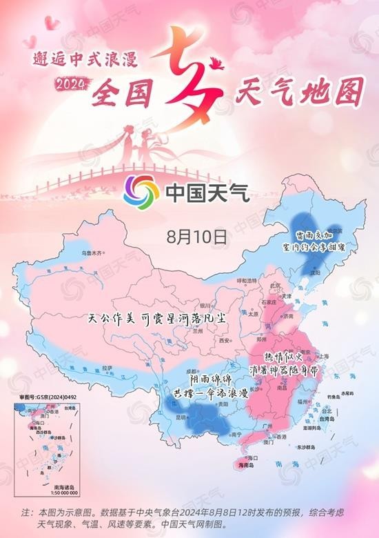 “天阶夜色凉如水,卧看牵牛织女星。”明天(8月10日)是农历七月初七,将迎来中国民间最具浪漫色彩的传统节日——七夕节。这里有一份全国七夕天气地图,看看你那里天气怎么样~