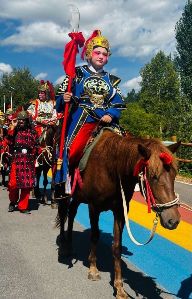8月9日下午,宁夏回族自治区固原市隆德县陈靳乡新和村,当地村民组建的“高台马社火队”巡游表演。中青报·中青网记者焦敏龙/摄