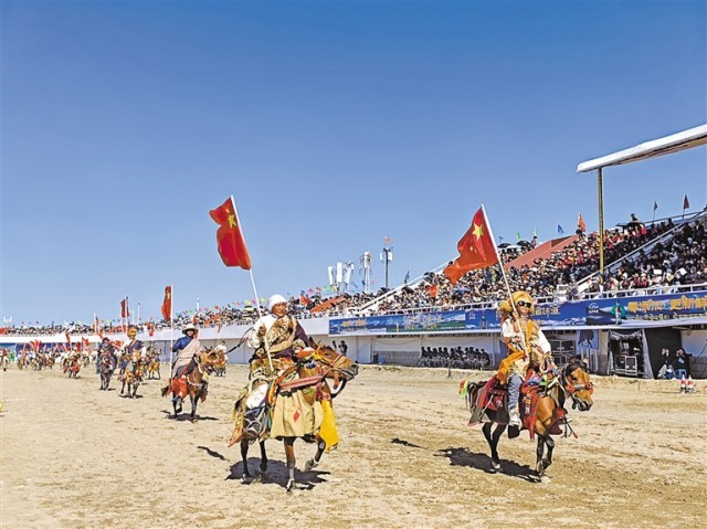 图为那曲恰青赛马节暨第三届“乡村振兴 那曲奋进”活动开幕式上,马术表演队隆重出场。